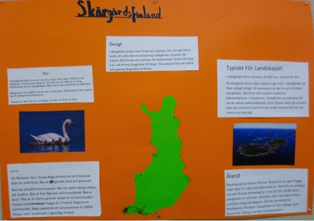 Den här veckan har eleverna i 3-4A presenterat några grupparbeten om Finlands olika landskapstyper. Först fick vi höra om Skärgårdsfinland. Ellen, Viktor och Krister berättade att det finns många öar, holmar och skär, man åker färja, Åland hör till skärgården och några vanliga fåglar är sångsvanen, knölsvanen och örnen.